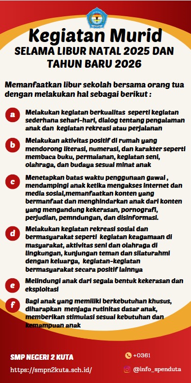 Dengan ini SMP Negeri 2 Kuta memberikan kesempatan bagi murid sekaligus ruang kepada keluarga untuk berkumpul melakukan perjalanan dan beraktivitas pada Liburan Semester Ganjil, Natal dan Tahun Baru.