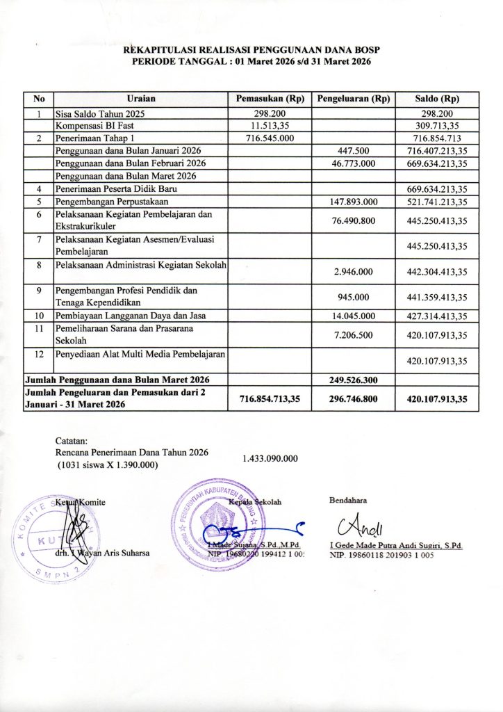 REKAPITULASI REALISASI PENGGUNAAN DANA BOS REGULER BULAN MARET